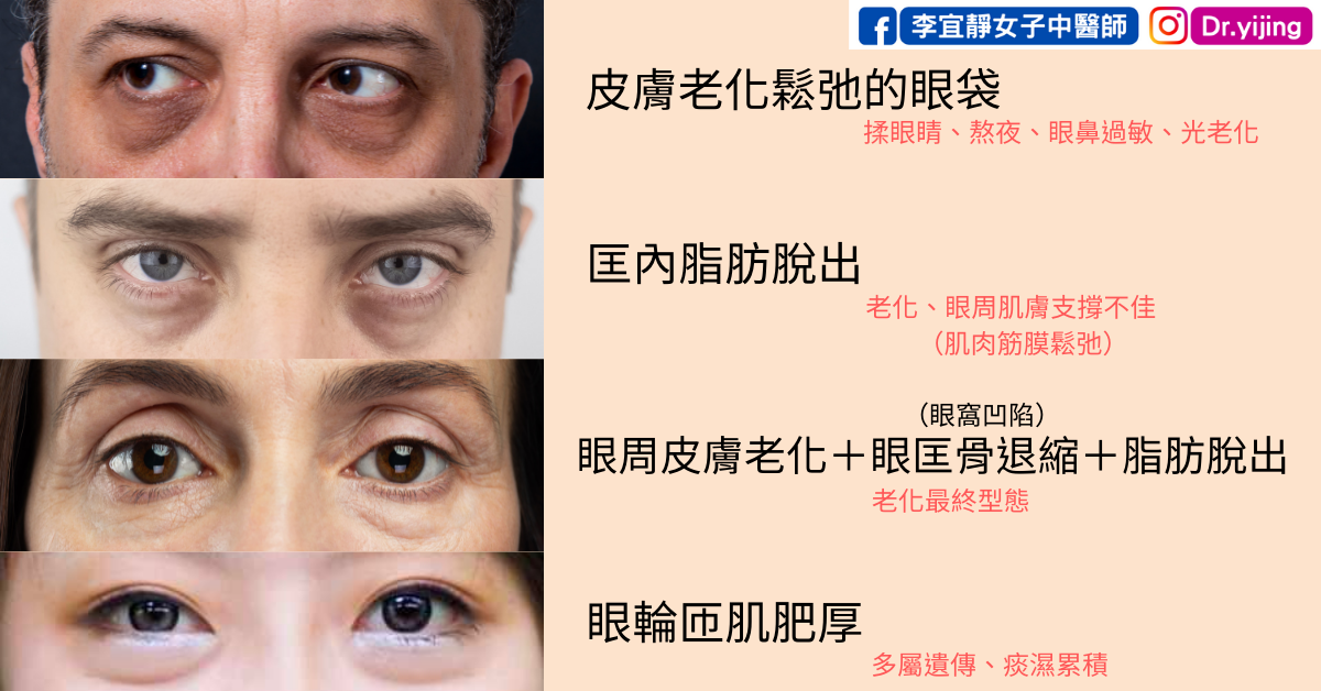 - 眼周皮膚老化+眼匡骨退化+脂肪脫出的眼袋:一般老到一定程度就或多或少一定會出現的眼袋,如果是比較肥,或是中醫講的脾虛痰濕腎虛人,眼袋會更明顯的一大包,這個太嚴重又想要恢復的很年輕,大概也是需要仰賴手術了。
