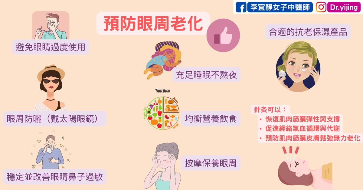 其他預防眼周老化的好習慣都在上圖了,應該都蠻白話的,李醫師就不重複廢話了。還可以詳細看看眼周的按摩(點這邊)有詳細介紹。也可以順便看一下擦保養品的手勢(點這邊)。