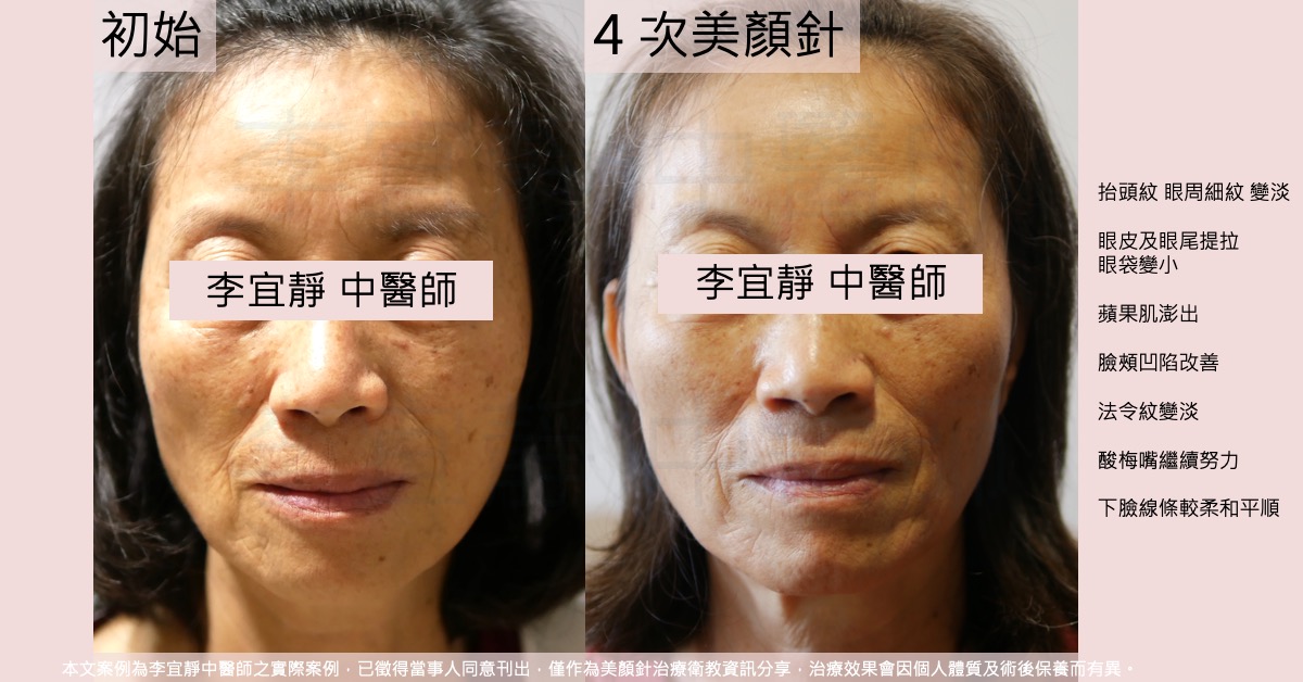 2 週一次的美顏針,四次美顏針後的當下,照片已經可以呈現明顯的改變。患者回饋眼周的拉提感受最多,可以很輕鬆的張開眼睛,很舒服,臉色亮了不少,看起來年輕許多。看照片的確眼皮有比較輕易可以打開的感覺呢。